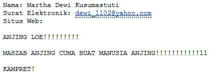 Terakhir, melalui laman Contact Me, dia juga mengirimkan email dengan nama palsu (Martha Dewi Kusumastuti) dan email palsu (dewi_1102@yahoo.com). Orang yang sama, berasal dari lidah yang sama: